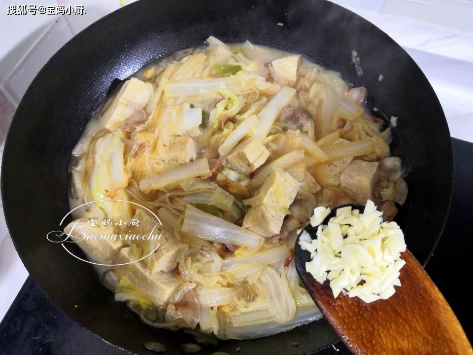 第七步,菜汤减少,粉条透明熟透,加入蒜末,大火翻拌均匀提香,关火出锅