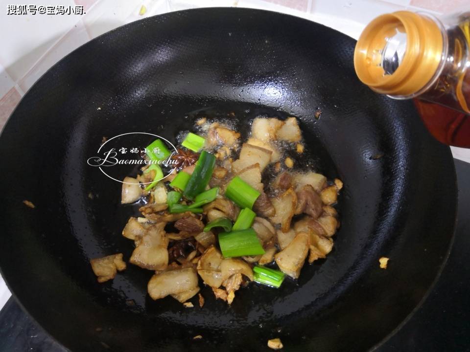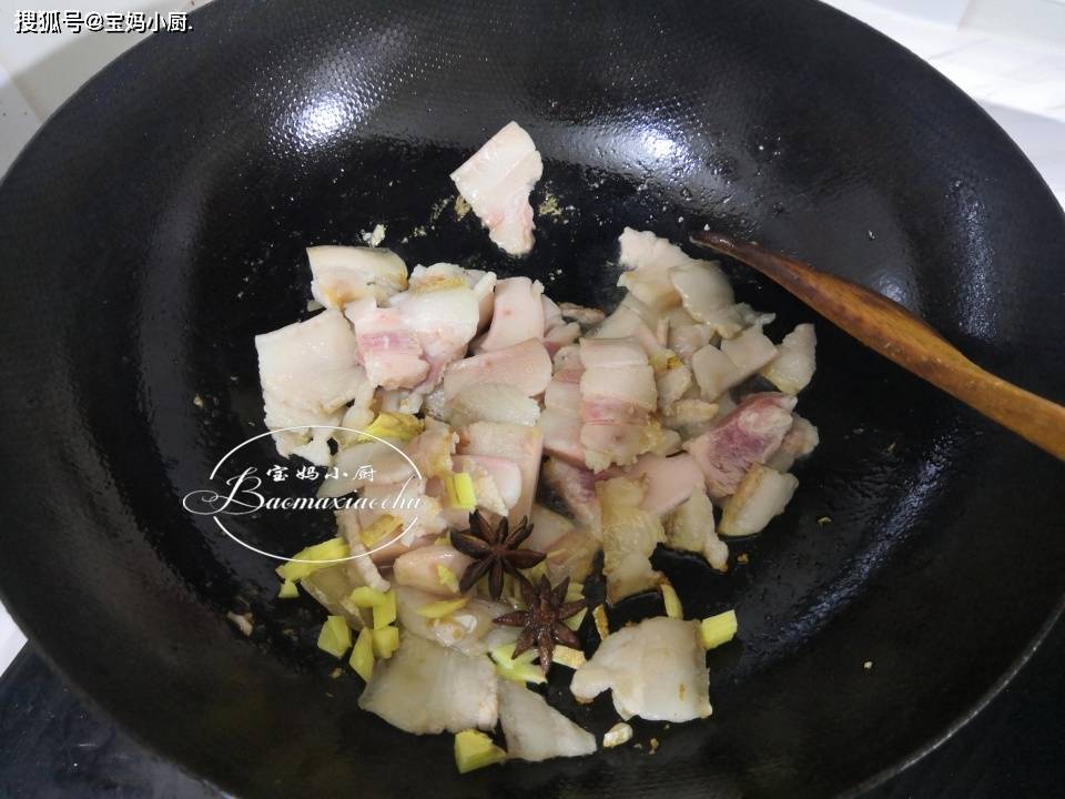第三步,炒锅加入植物油烧热,放入肉片、八角、姜末,中大火翻炒至肉片变黄、吐油