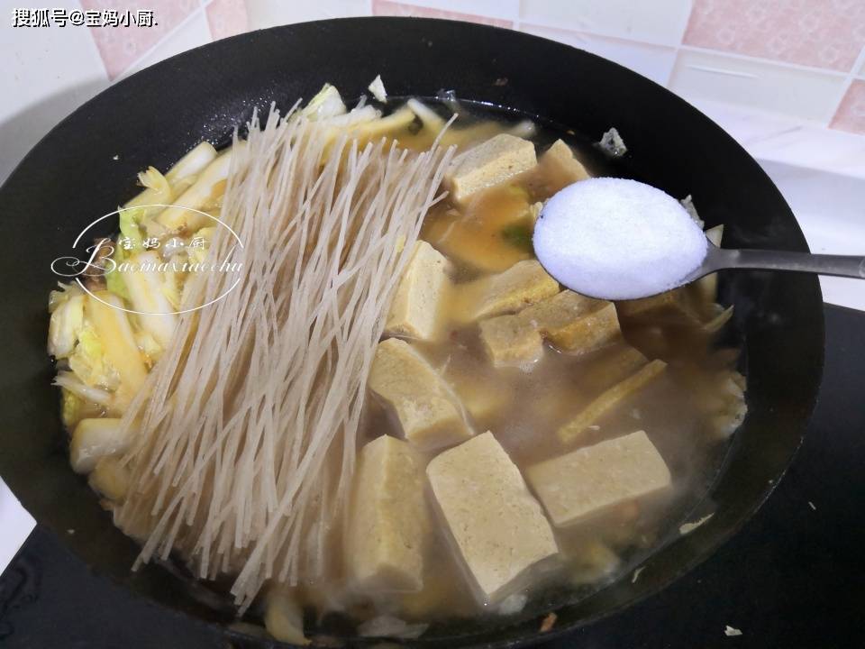 第六步,加入没过食材的清水,放入冻豆腐,粉条冲洗一下一起下锅,加盐调味,开大火烧开锅后炖10-12分钟