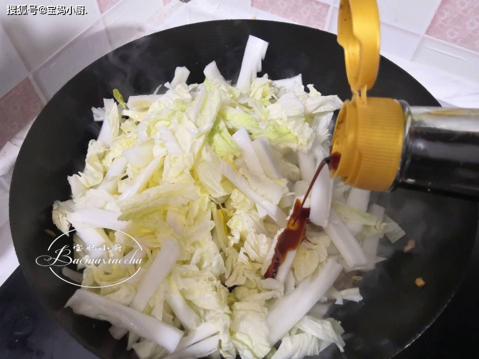第五步,倒入白菜,加入酱油提色,开大火煸炒至白菜微蔫