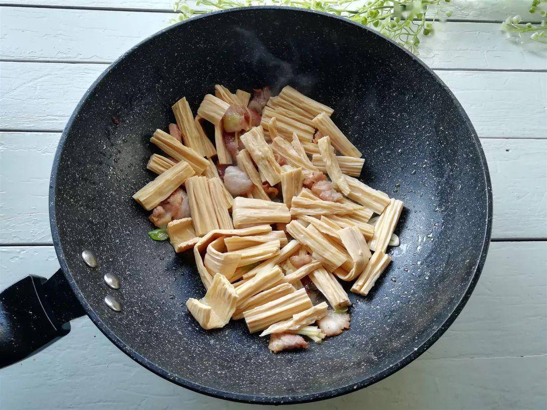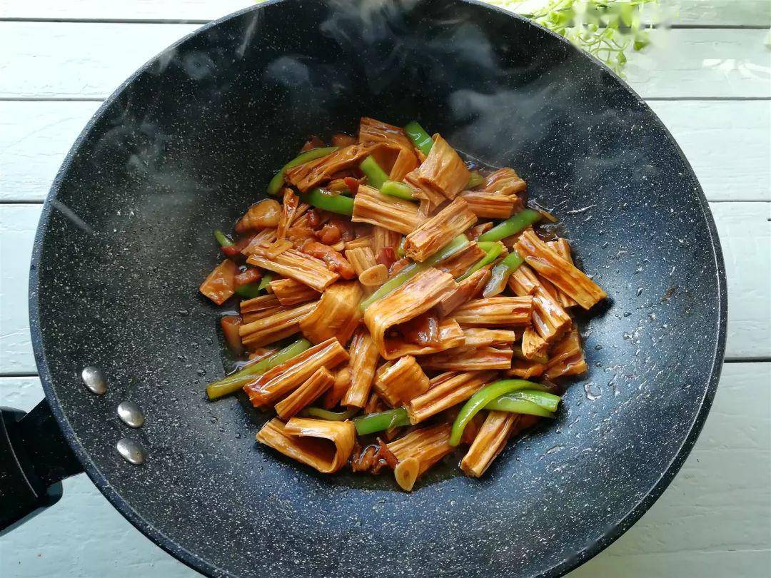 4.下入腐竹翻炒几下,淋入料酒和酱油翻炒均匀。