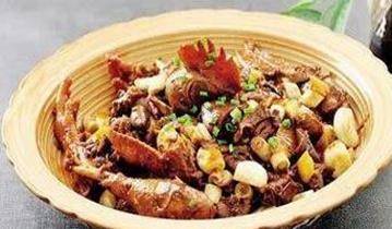 4捞出鸡块去掉渣,保留原汤汁下入蒜子20克,大火自然收汁,出锅前下入大葱20克装盘,撒葱花2克即可。