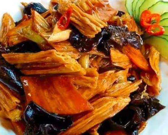 材料:泡发的腐竹300g,泡发的木耳100g,胡萝卜50g。葱,姜,蒜,料酒,酱油,糖,蚝油适量。