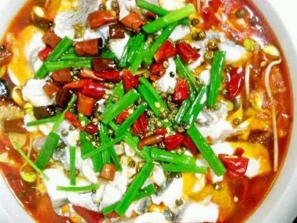 2.少许水烧开,放入鱼片烫熟,立即捞出。装锅,油烧热后加干红辣椒和花椒若干,待油锅中辣椒颜色略微变黑的时候,将油浇在鱼片上面;