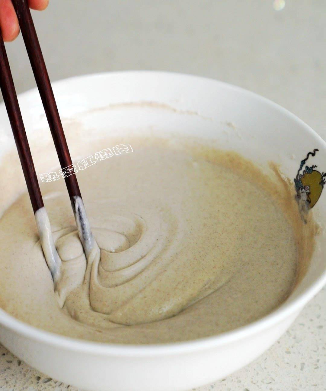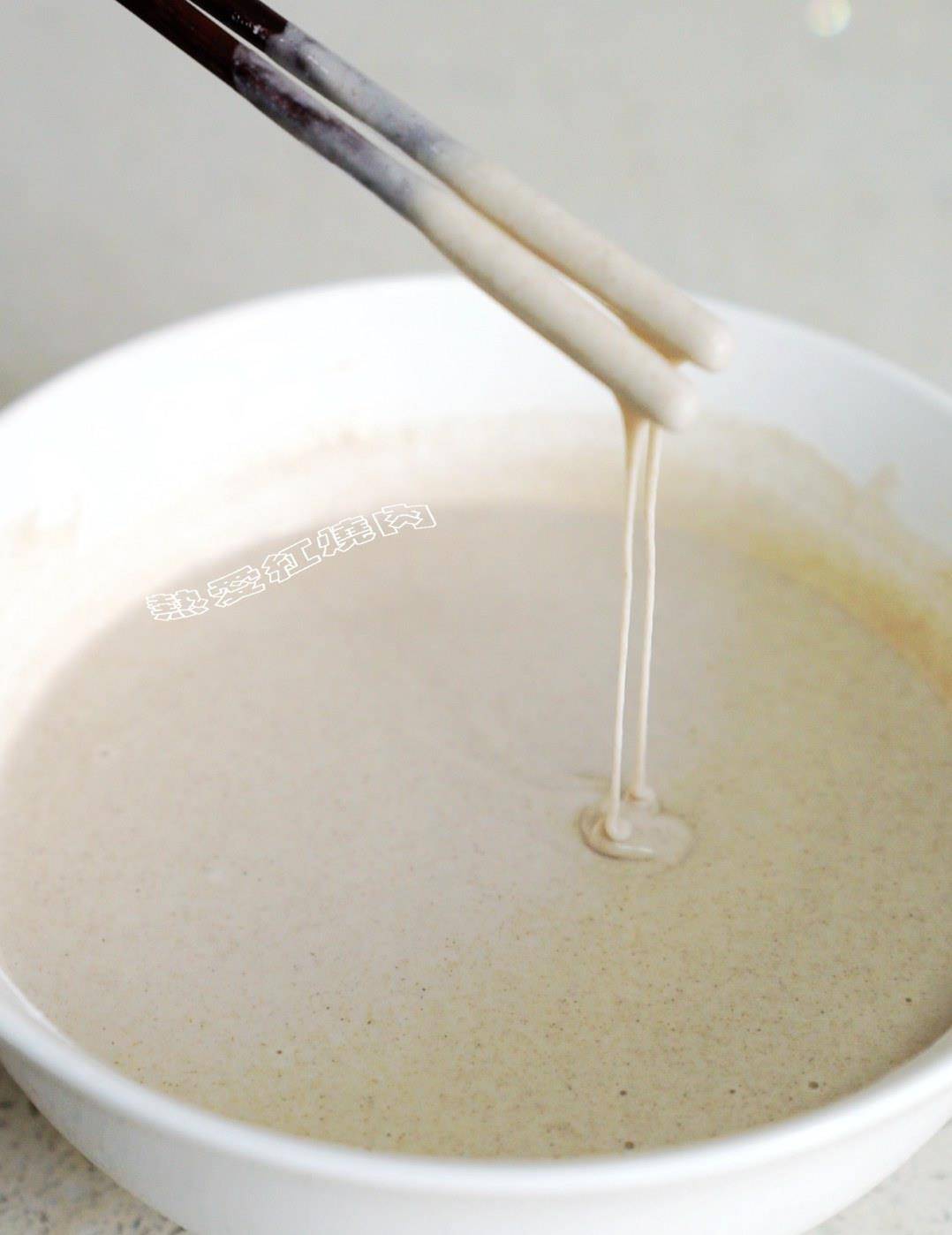 5然后再加一些清水进去继续搅拌,搅成图上这种挑起来的面糊会成线状下落就行。