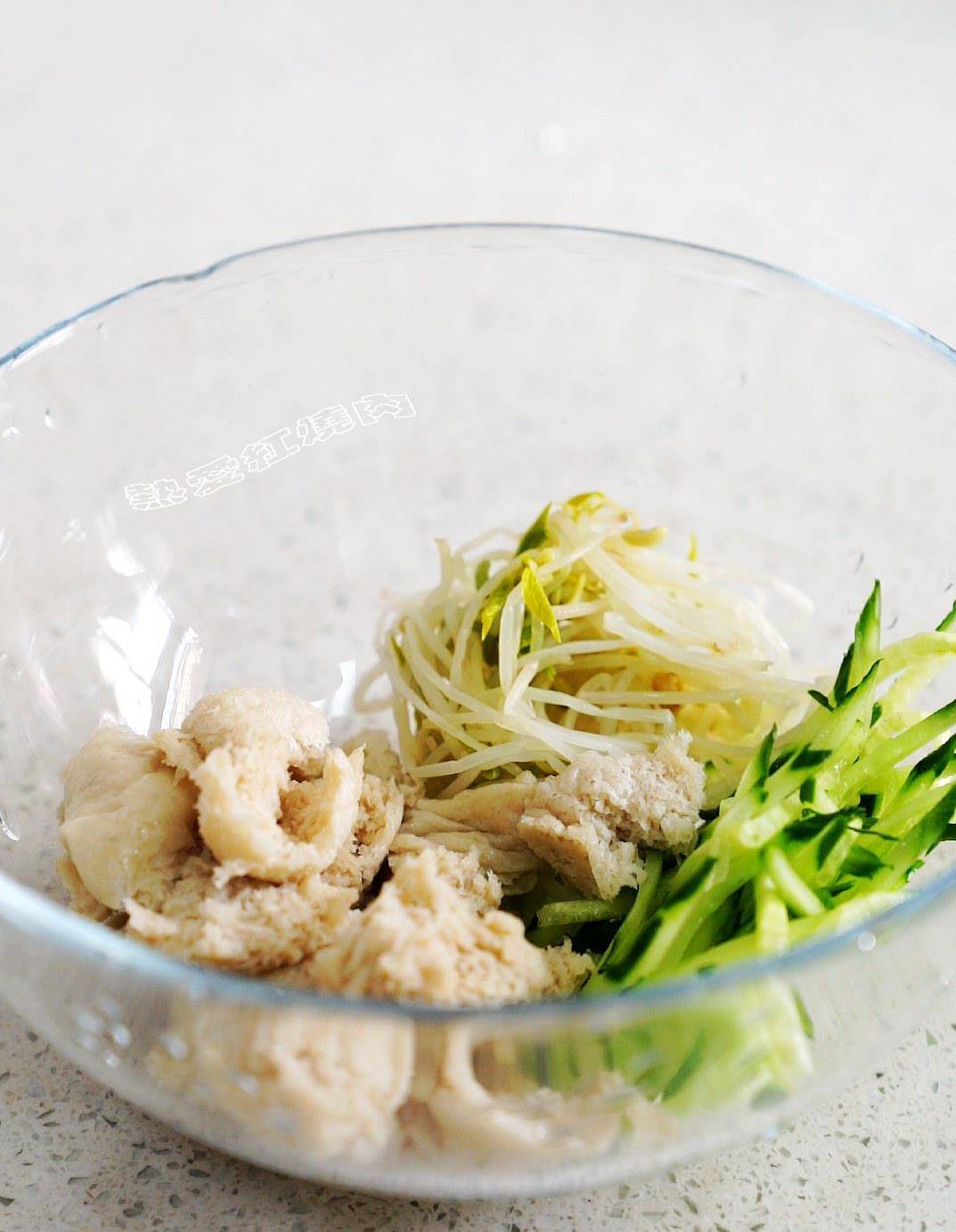 12取一个沙拉碗,碗里放上自己喜欢的蔬菜丝,我放的是自己做的面筋黄瓜丝和焯过水的绿豆芽。