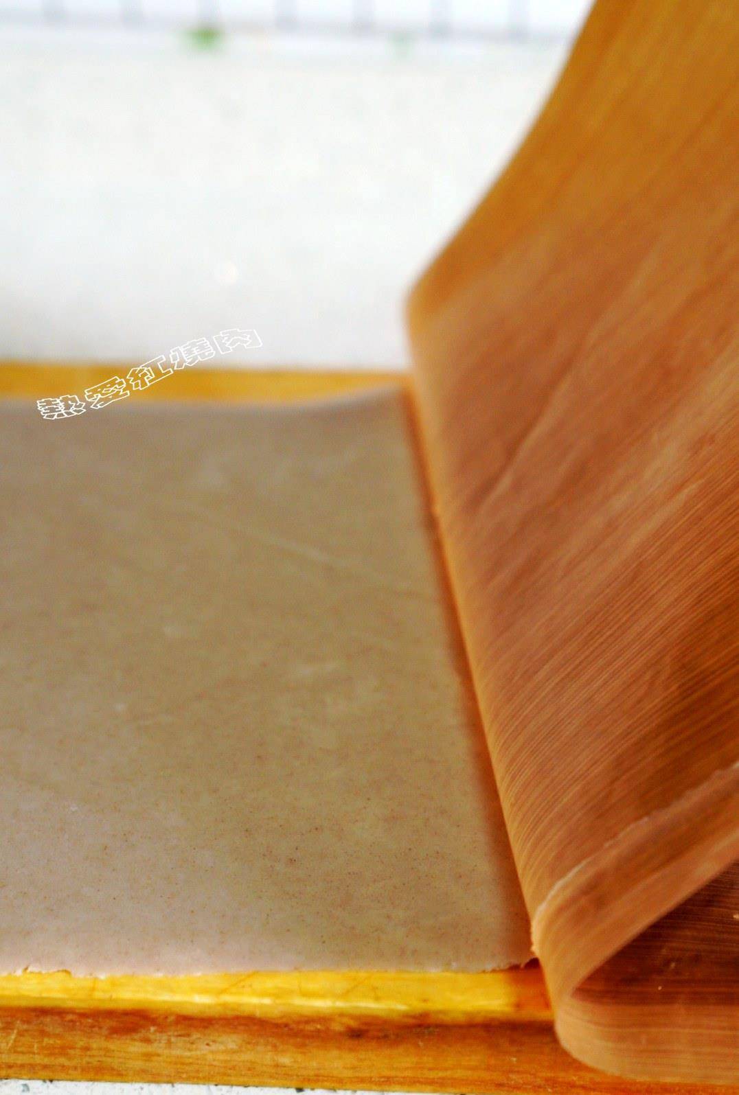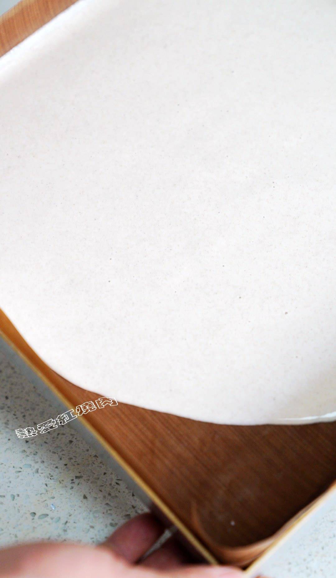 10蒸好以后提起油布把面皮倒扣在案板上,你看油布上一点面糊都没沾上效果特别好。