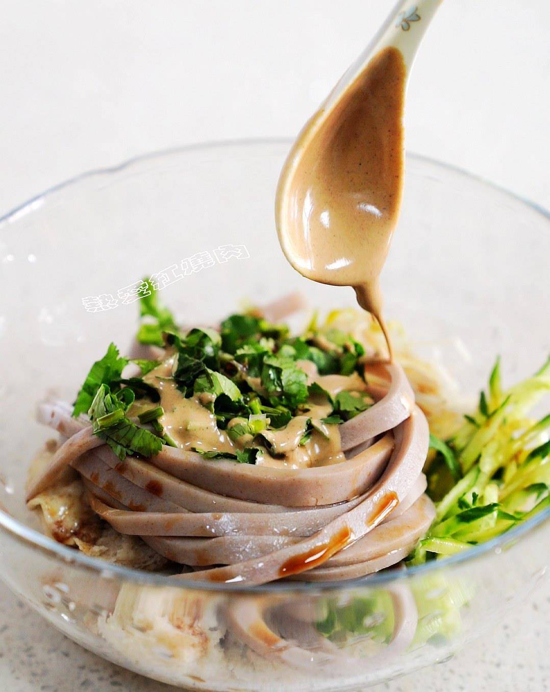 怎么样?看着有食欲吗?常吃些荞麦面粉对身体健康也很有好处,这个做法真的是粗粮的一个绝对好吃的做法,口感细腻绝对不粗,有想吃粗粮又怕口感不好的朋友快试试看吧!只要你爱吃拌凉皮,估计不会不爱吃这个的。