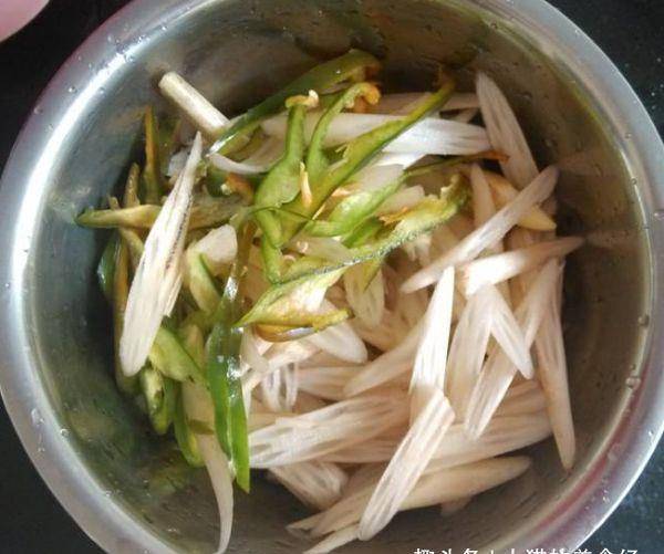 2,这个时候,青椒去蒂,将辣椒籽清理干净,冲洗之后,切成丝放在一边,大蒜也要切成颗粒形状。