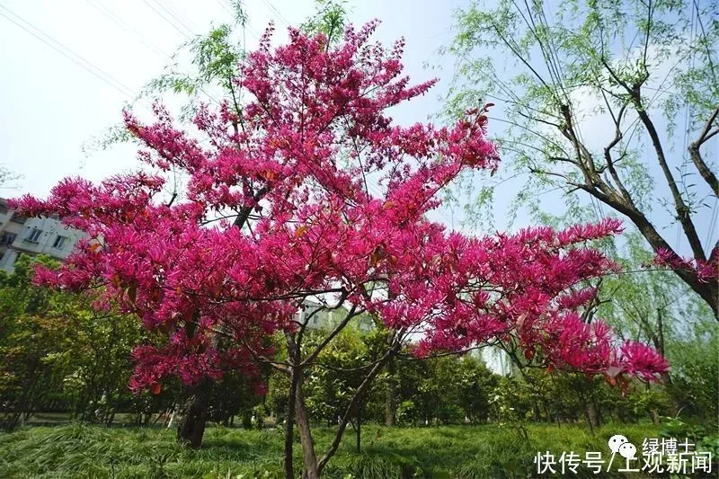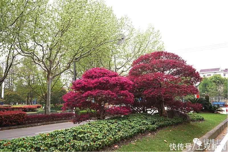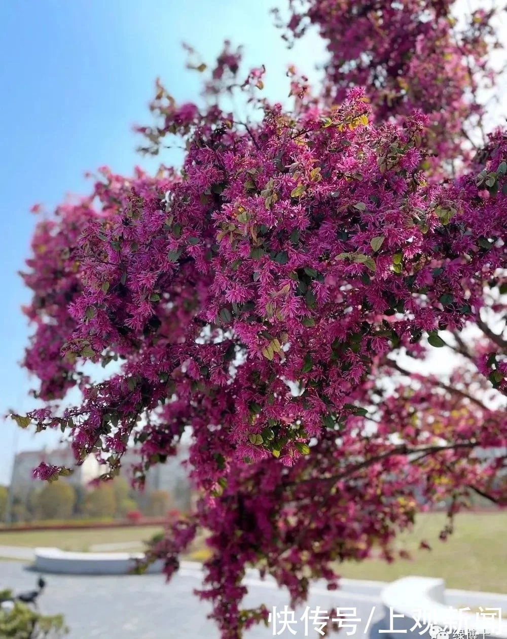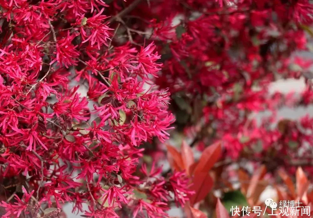 红花檵木的花色紫红,花期为3-5月。它枝繁叶茂,姿态优美,在申城的道路绿化和公园绿地均有种植。花开时节,满树红花,极为壮观。你们看,它们正在展现最美的姿态↓