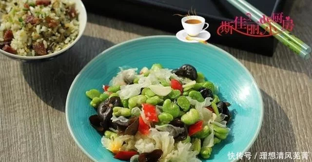5.煸炒出香味后加入焯煮好的蚕豆米和黑白木耳进去翻炒;