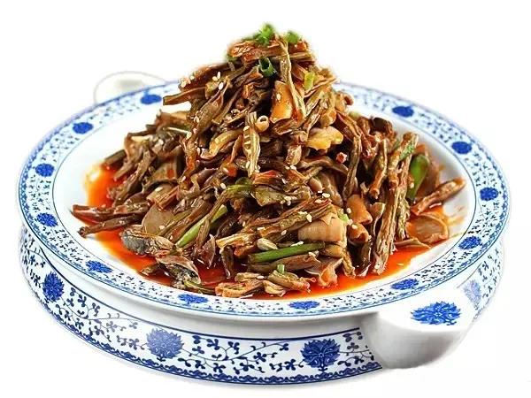 3.另把腌干笋泡涨,入沸水锅汆水后,捞出切丝,再放入加有少许油的炒锅炒香待用。