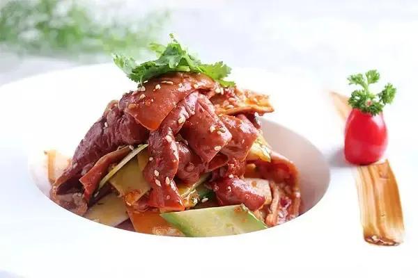 1.牛脸多采用烧扒的方法成菜, 这里将其与腌笋丝同拌,麻辣可口,滋润鲜香。