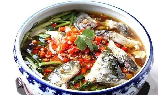 2.把草鱼宰杀治净并剁成块,用盐、姜葱汁和料酒腌渍入味后,放入沸水锅里煮熟,然后捞出来投凉,装入汤盆里。最后将味汁浇在盆中鱼块上浸泡入味,点缀香菜叶便可食用。