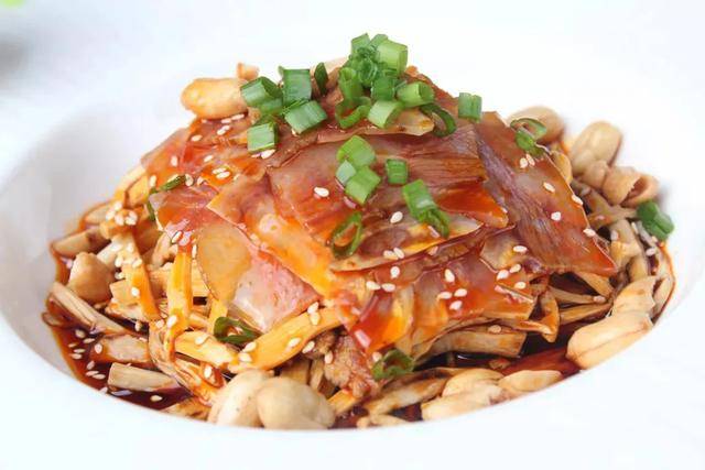 4.出菜时把牛脸切成薄片,纳盆加炒过的笋丝、盐、味精、白糖、红油、醋、白芝麻、花椒面和葱花拌匀,装盘即成。