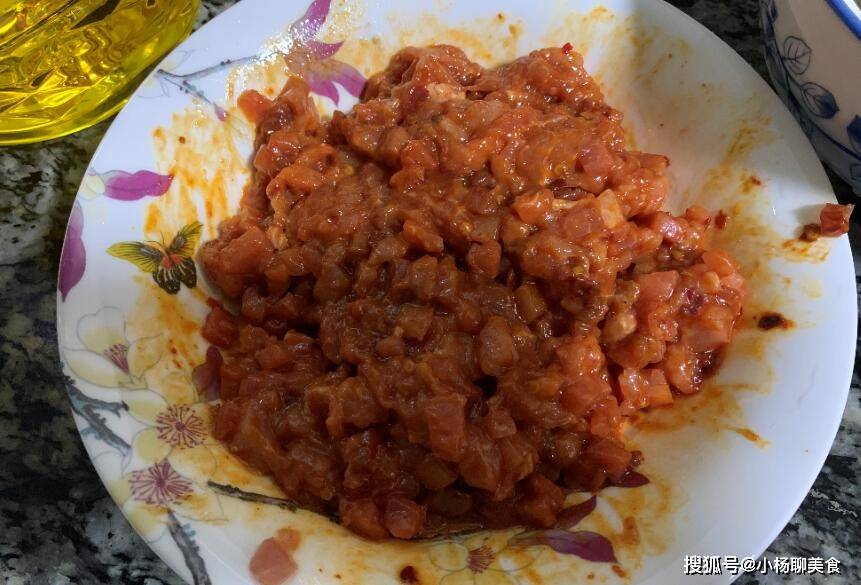 豆腐焯水后捞出来,用水泡起来,以免粘在一起,接下来再准备好一块瘦肉,把瘦肉切成丁后,放在碗里,加入豆瓣酱、酱油、蚝油、盐搅拌均匀后,再放入适量的淀粉搅拌均匀。