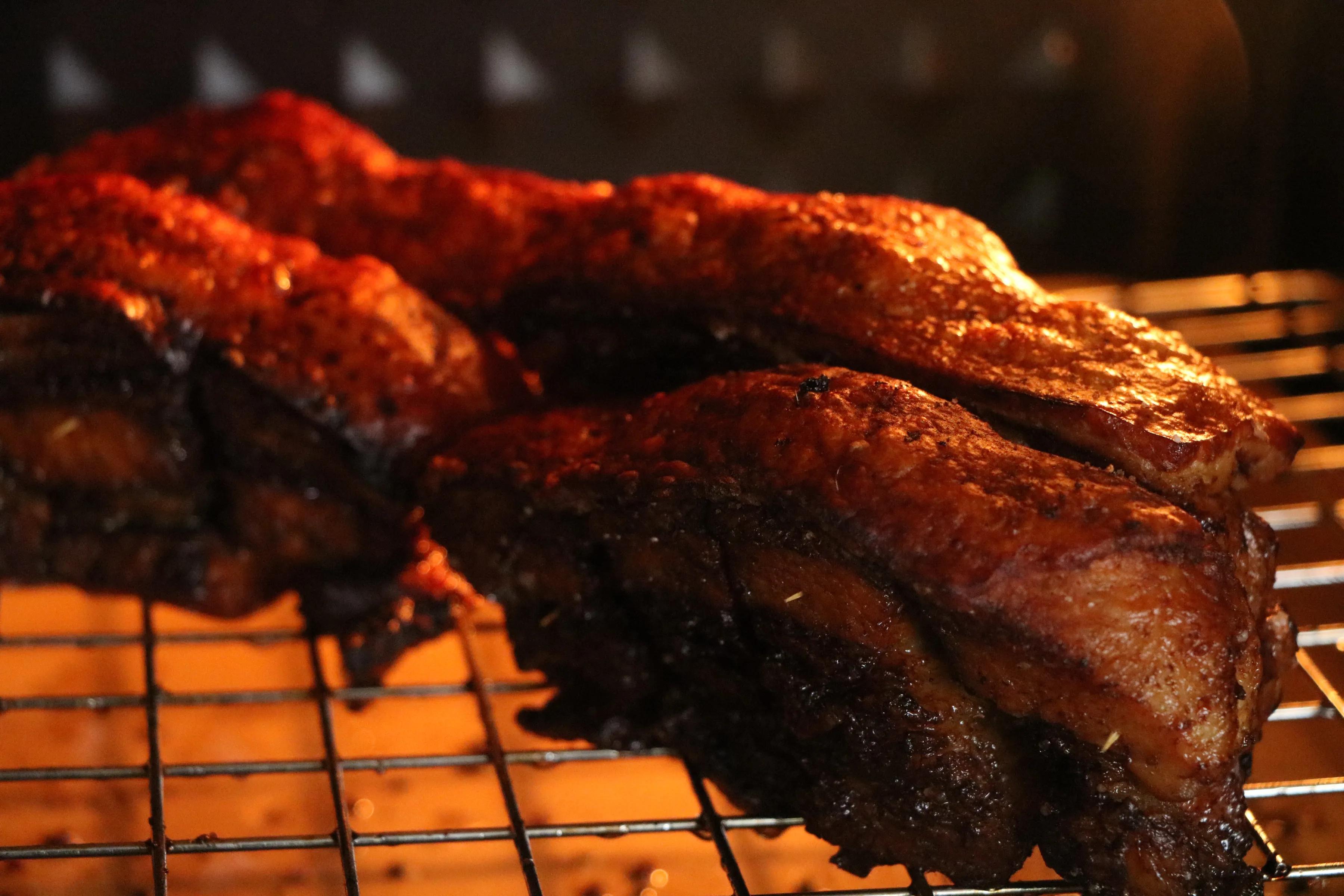 9、再回烤40分钟左右,皮要朝上烤;烤到表皮脆脆的就可以;(第二次放在烤架上烤,底下放烤盘)