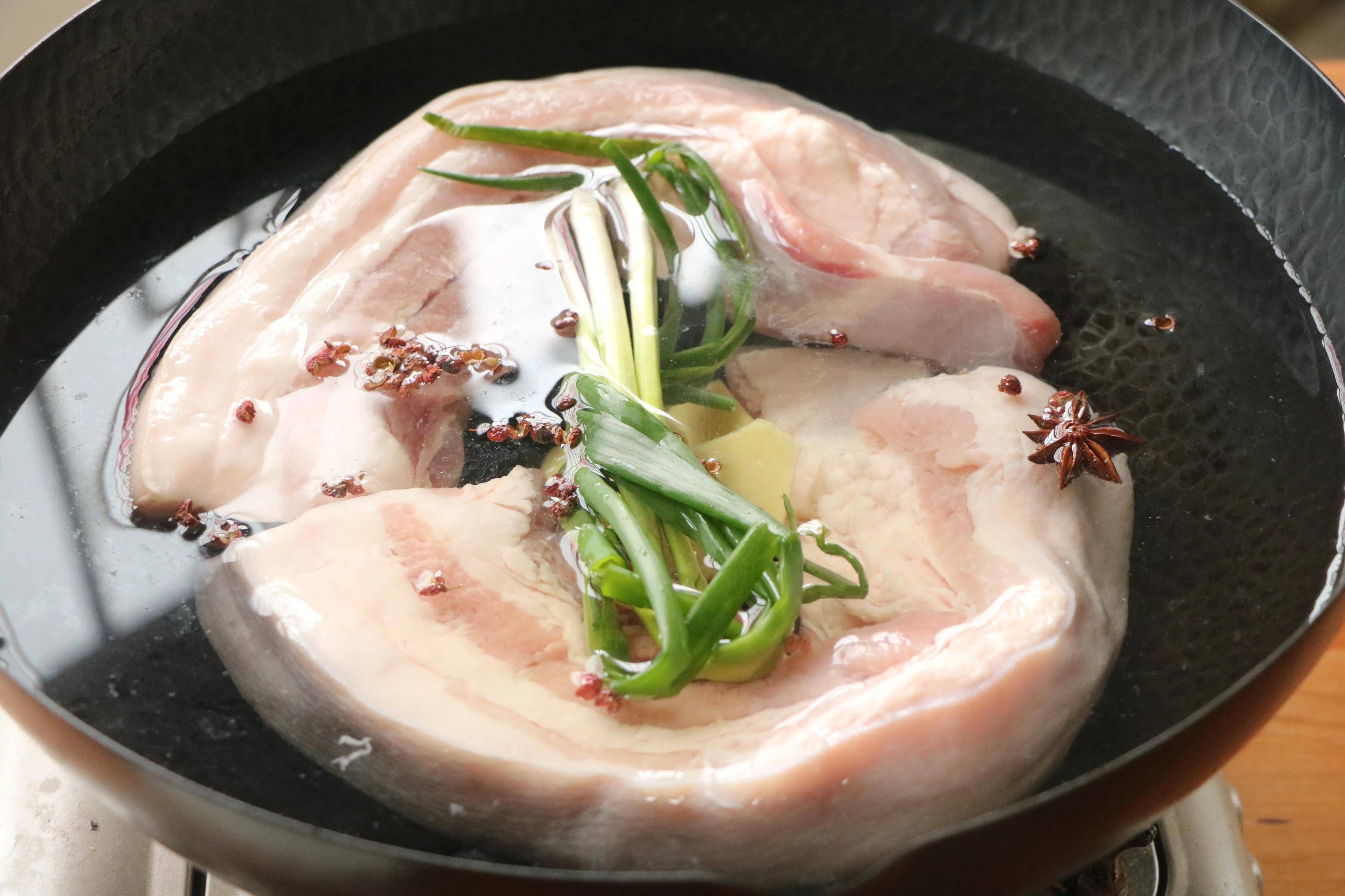 1、五花肉洗净冷水放在锅中,加入葱、姜、料酒、八角、花椒焯水;