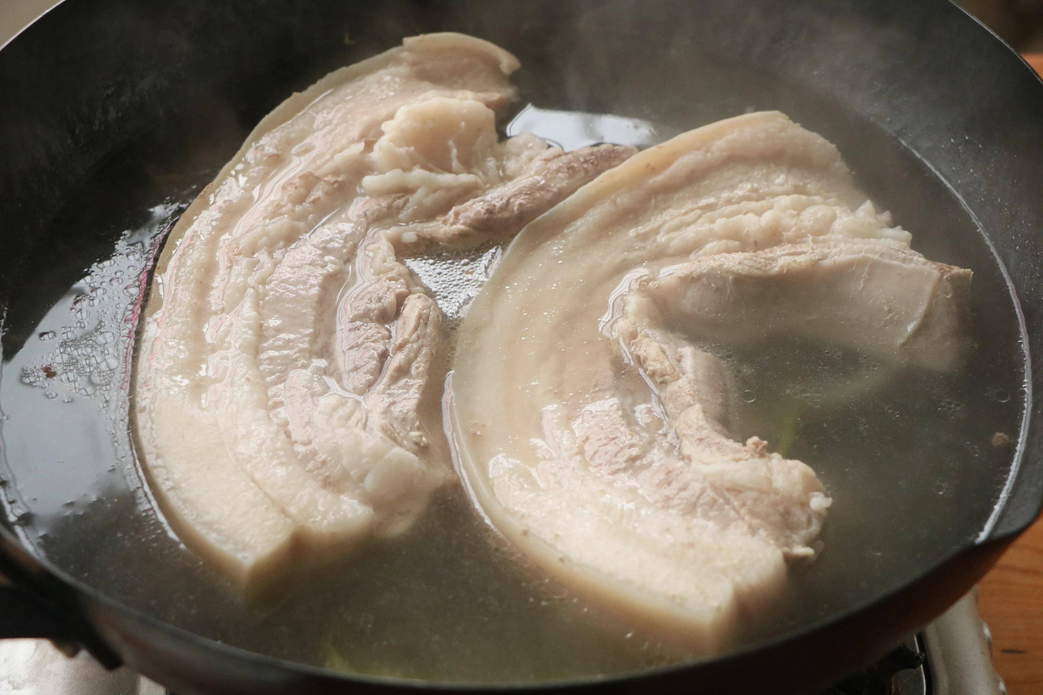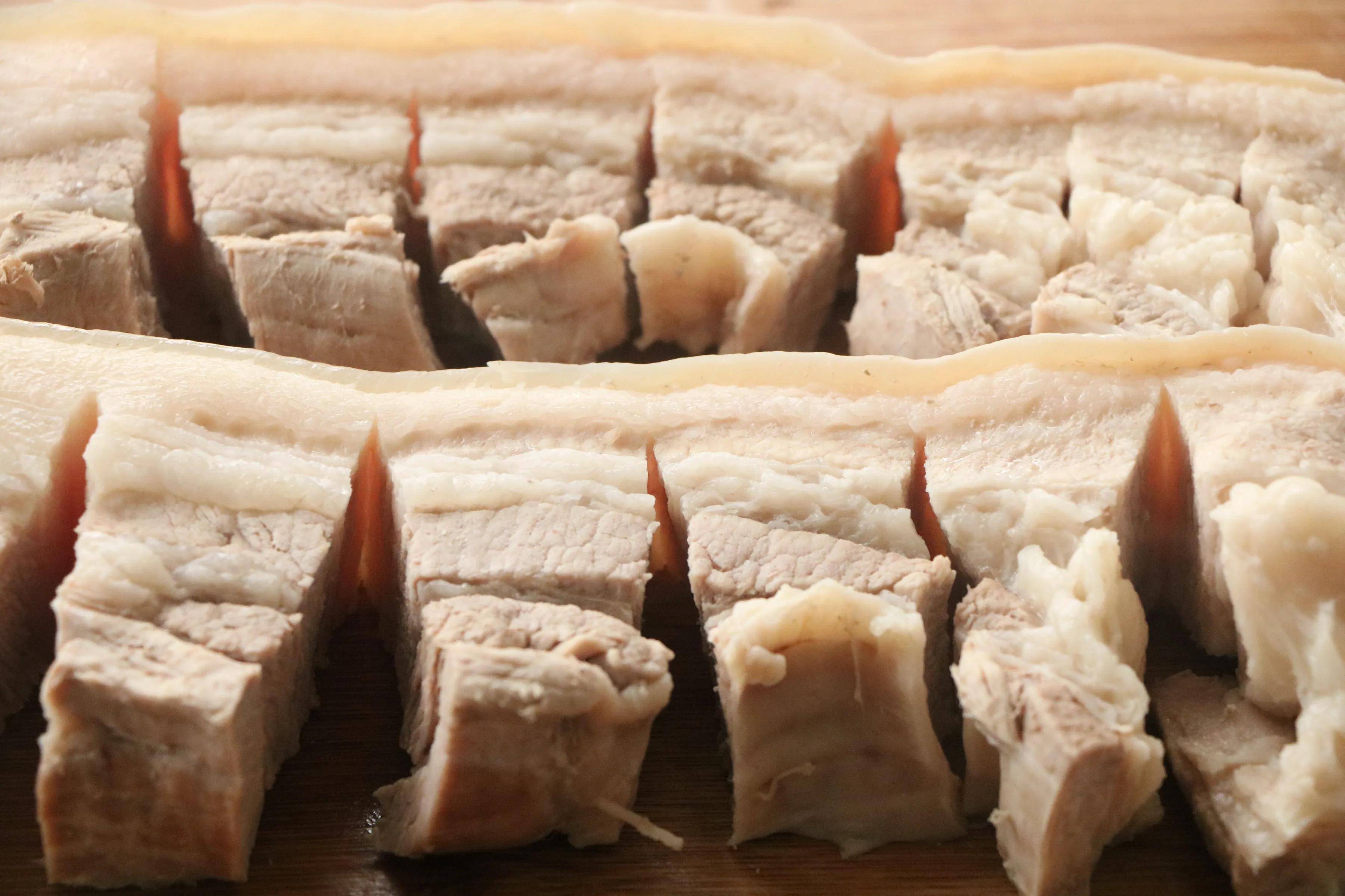 3、煮好的五花肉捞出来,擦干水分,然后切成小块,但是皮不要切断;
