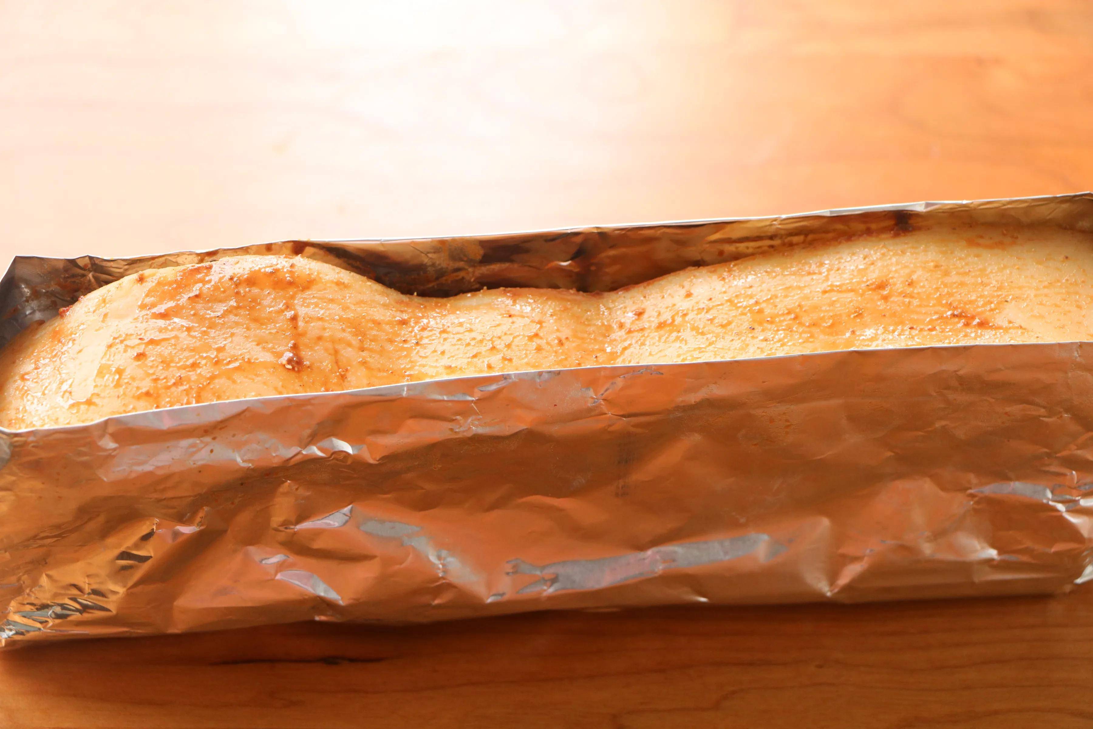 6、再把五花肉包上锡纸,把皮的部分漏出来,把表面的调料擦干,刷一层白醋;五花肉建议用整块的,切条的五花肉包起来费劲,放进烤箱站不稳。)