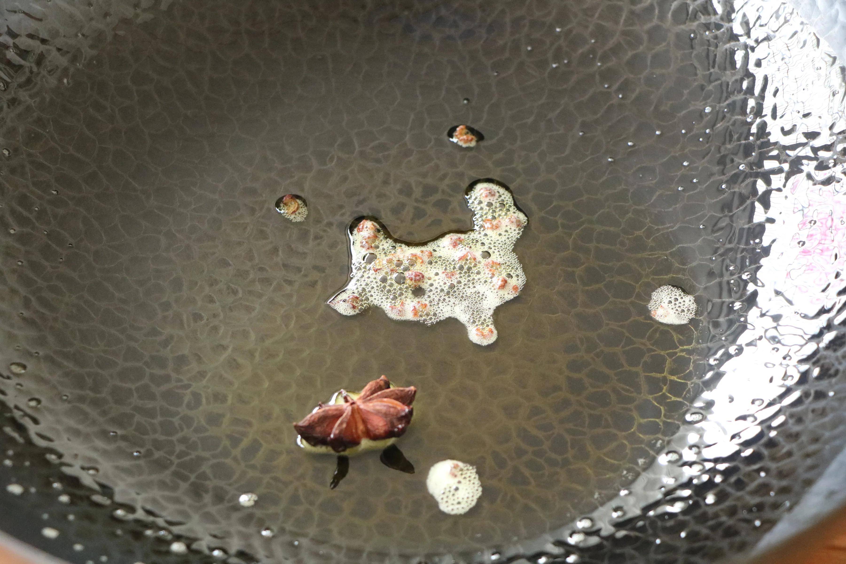 3、锅中加入植物油,油热后把花椒、八角加进去炒香;