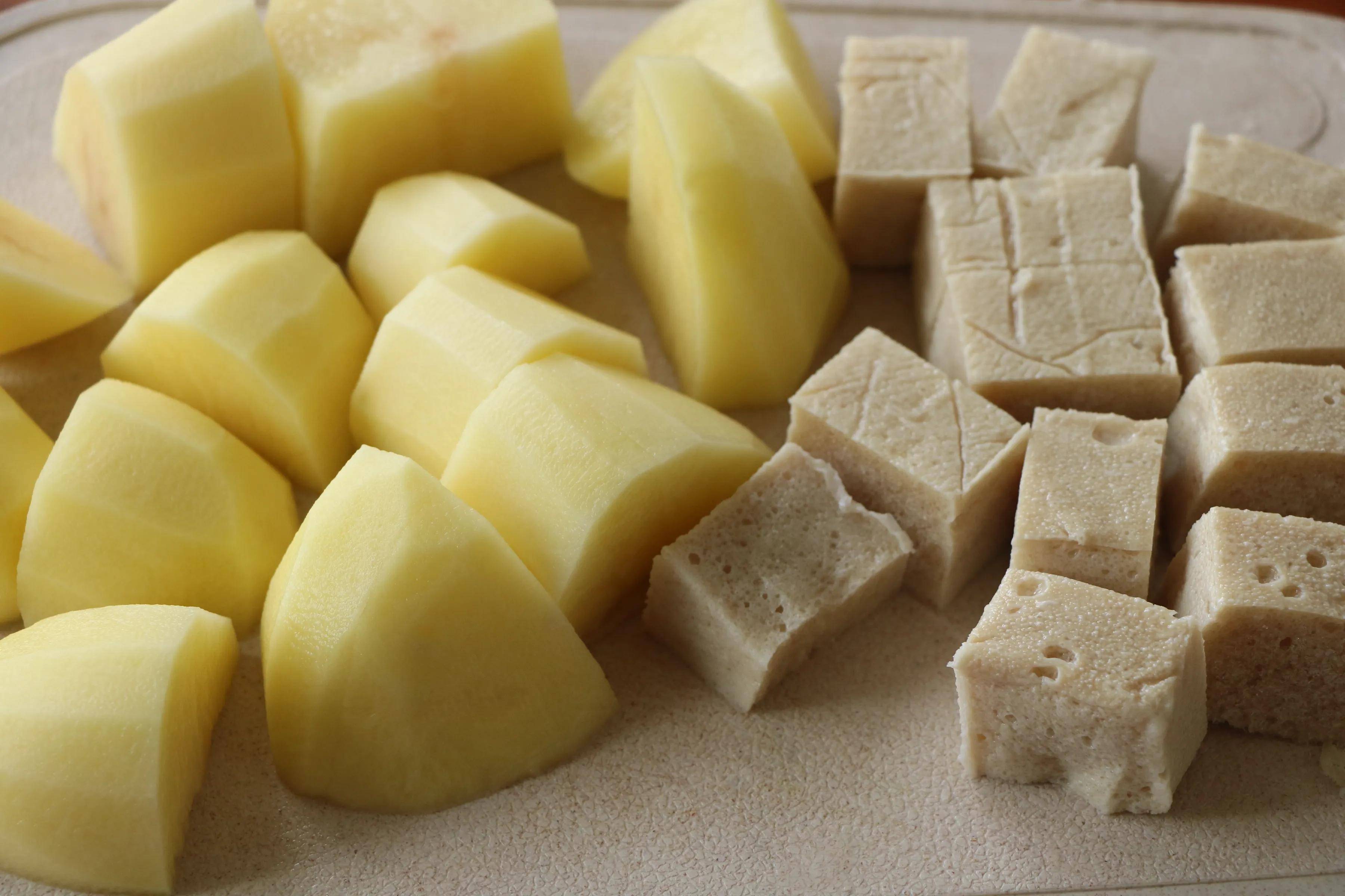 7、土豆去皮后切成稍微大一点小块;千页豆腐也切成小块;