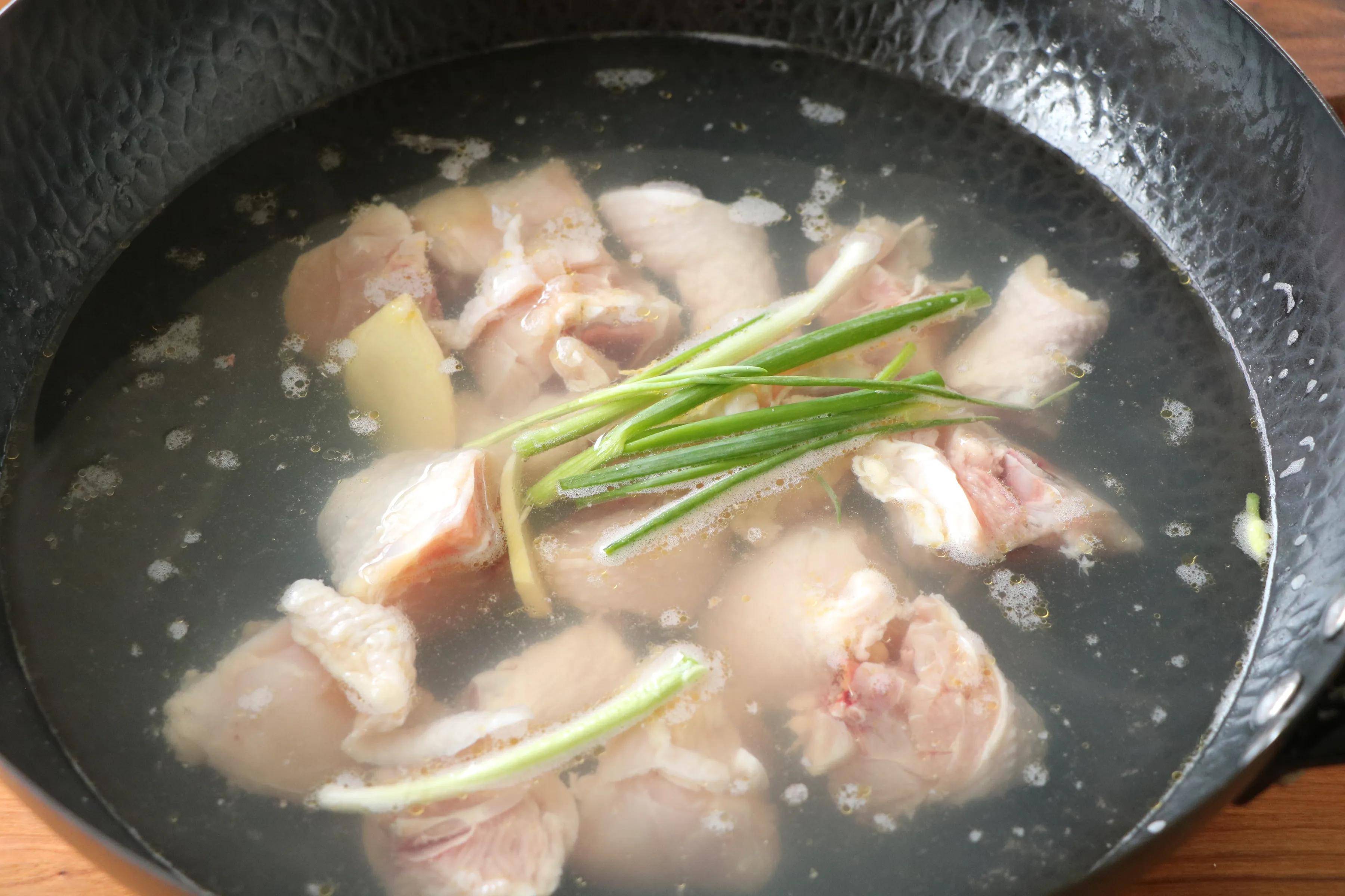 1、鸡腿剁成小块,冲洗干净,冷水下锅,加入葱、姜、料酒焯水;煮开之后把浮沫打掉,继续煮2分钟左右;