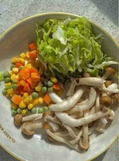1.将卷心菜、三色蔬丁、菌菇混合后,加入面粉、黑胡椒、五香粉、香油、少许盐,搅拌均匀备用。