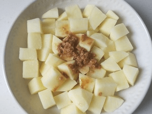 11.把刚才排骨料理碗里的剩余酱料和蒜蓉倒进土豆里。