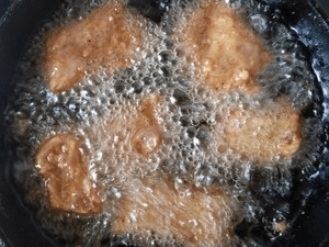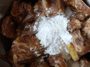 8.排骨腌制入味后,中小火油炸至金黄。油炸之前再把淀粉抓一抓,否则淀粉容易沉淀。