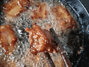 2、油炸的过程火不要太猛,炸到全熟,成色请参照菜谱的图上所示,要让排骨在油温的作用下,充分激发出肉香味。否则,不仅成品色泽不好看,香味也达不到要求。