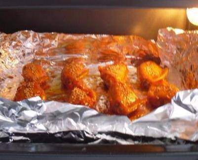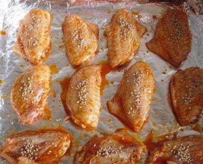第六步,腌好的鸡翅取出来,均匀的摆在烤盘上,再刷上一遍腌料汁;