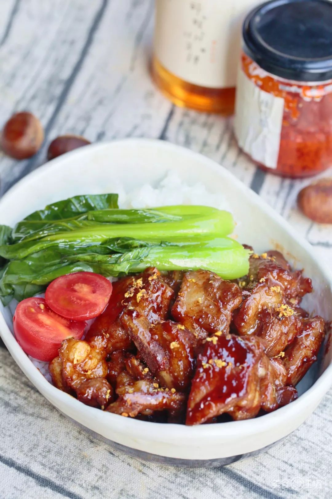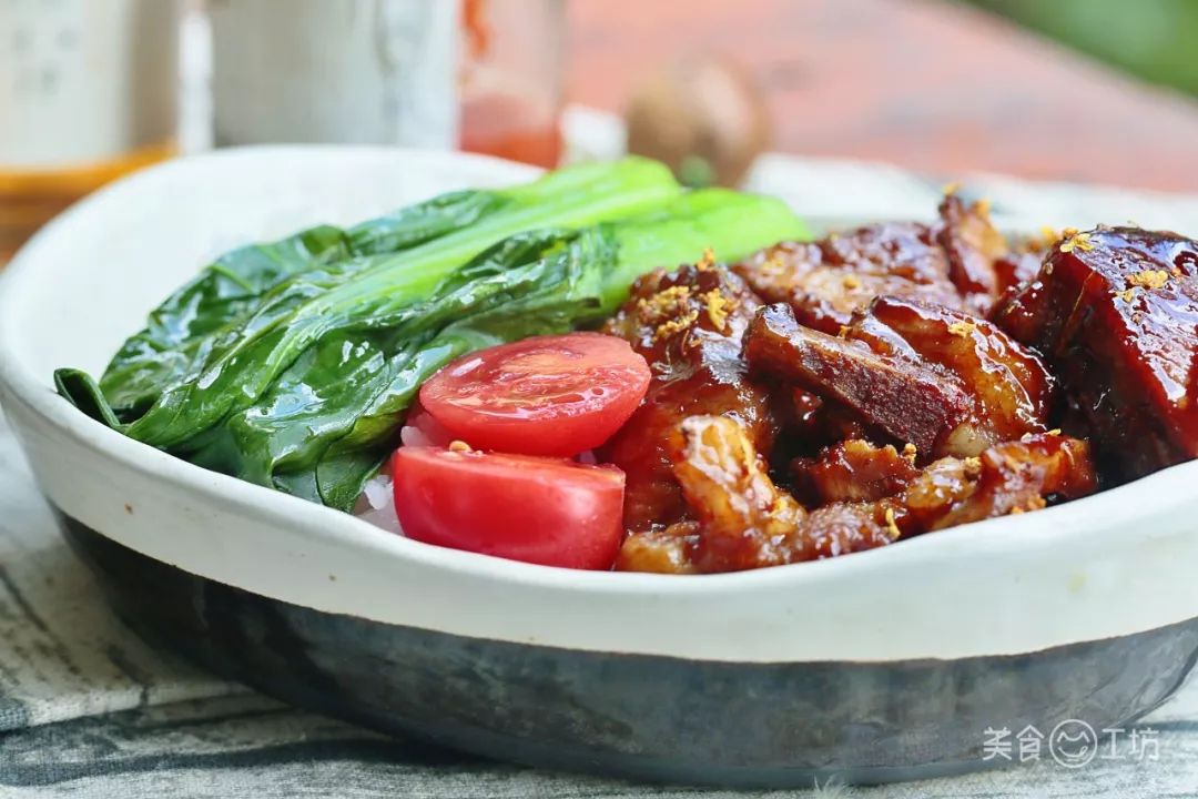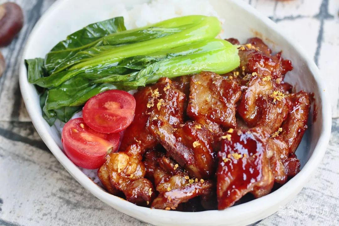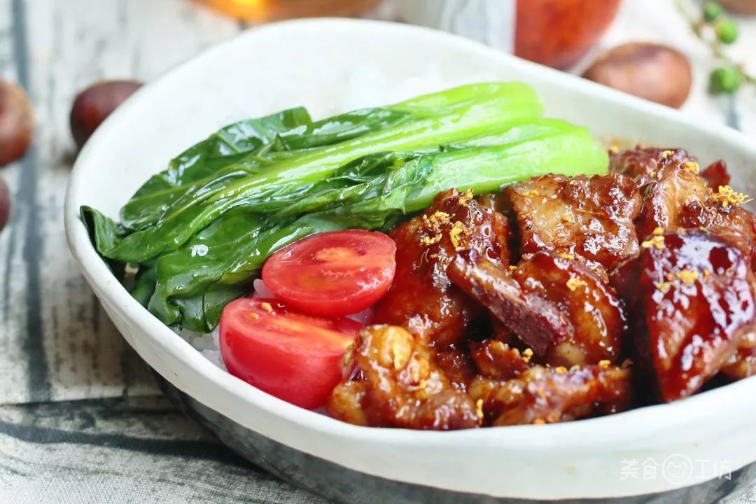 盛盘后,可用焯烫过的青菜和小番茄做点缀,这一盒便当,可比外面卖的货真价实得多了。