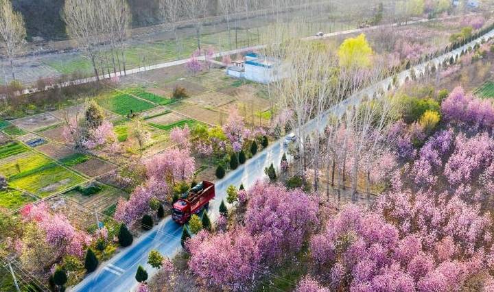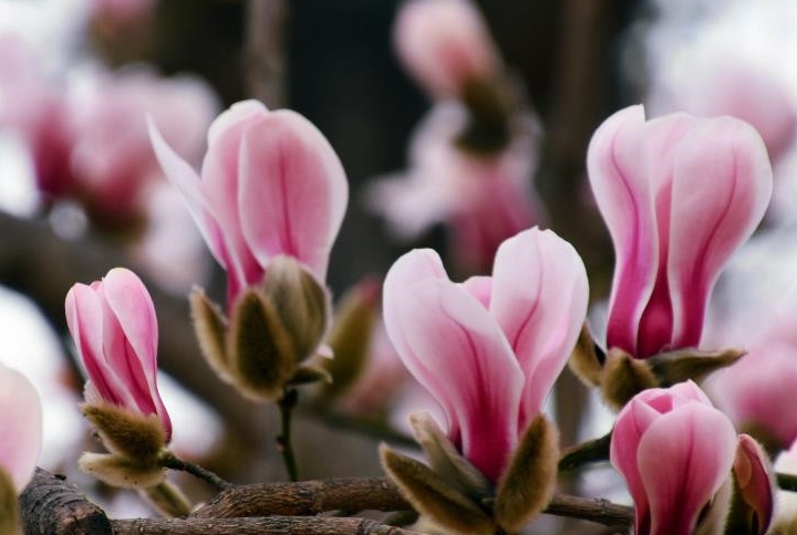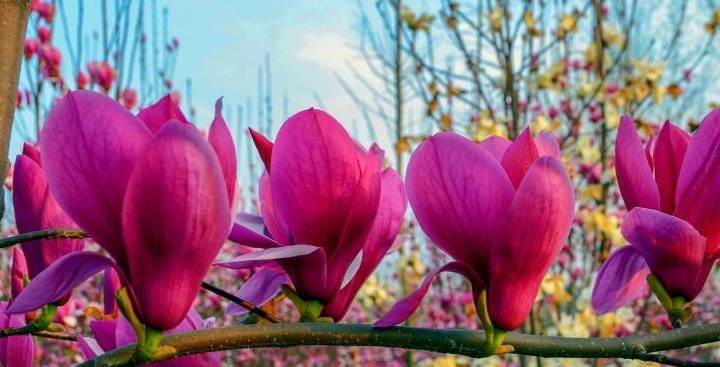在浅山原野里一块块田畦里一株株玉兰苗木你不让我,我不让你,都开满了花赶趟儿,姹紫嫣红,争俏闹春,硕大的玉兰花红的像火,粉的像霞,白的似雪,五彩缤纷,蔚为壮观,宛如一幅幅美丽画卷。