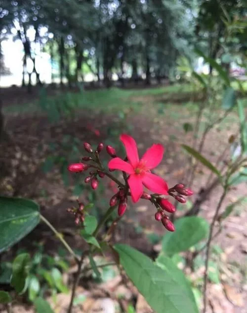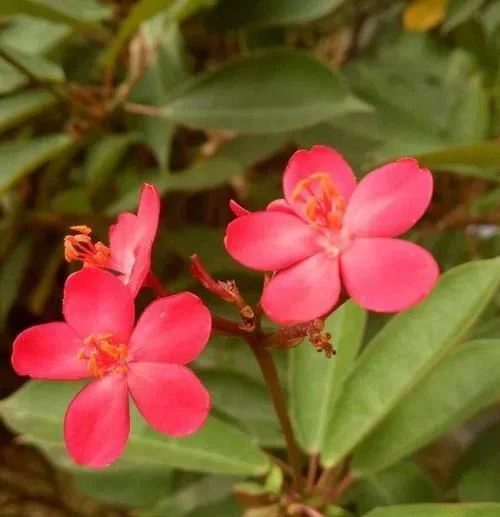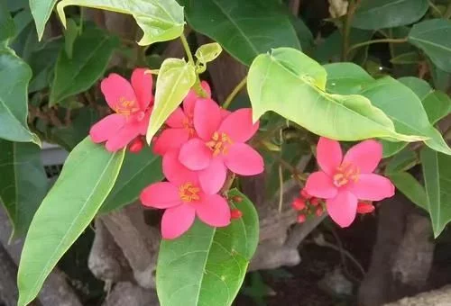 它就是琴叶珊瑚,我们那里的人是叫日日樱。它的特点就是可以经常开花。但是它对环境要求比较高,特别喜欢高温高湿的环境,对光照也有适当的要求,它在半阴处、树荫下都能生长,但养在那些没有阳光的地方,会导致开花减少,甚至就没有花朵观赏。