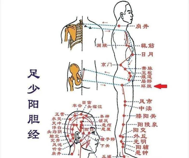 环跳穴是足少阳胆经的经穴,穴近髋关节。