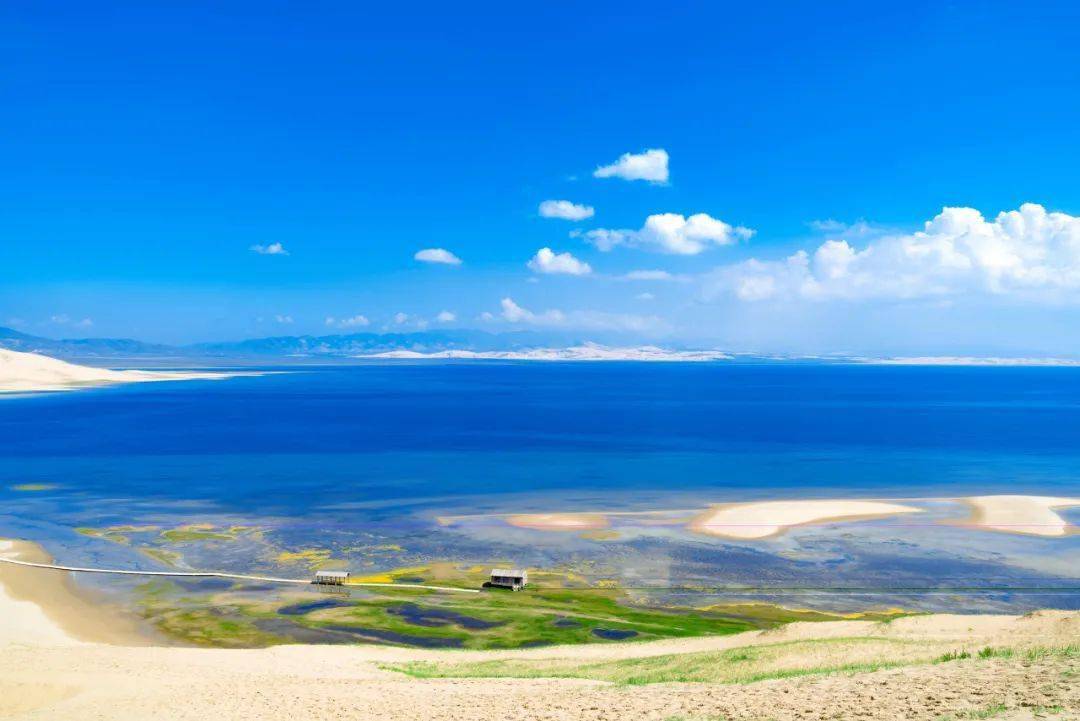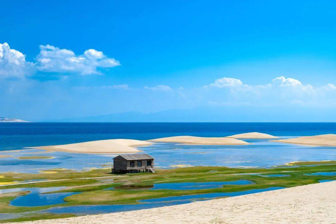 湛蓝的湖水、浅色的黄沙、简洁的小木屋