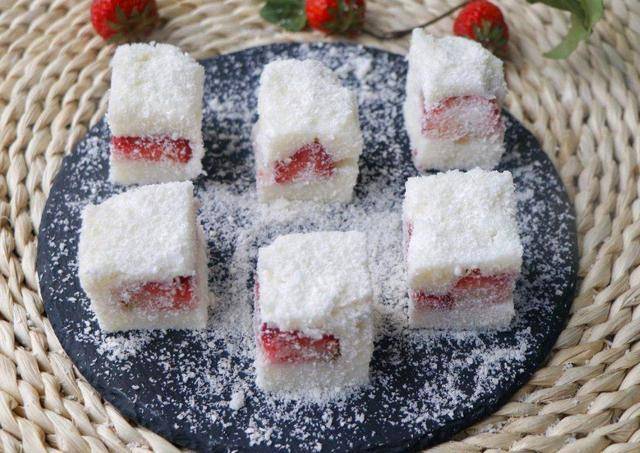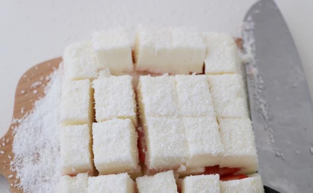步骤六:然后自然冷却到室温,再放入冰箱冷藏几小时,这样一来,就可以把这些材料取出来切成小块,还可以撒一些椰蓉,吃起来很美味。