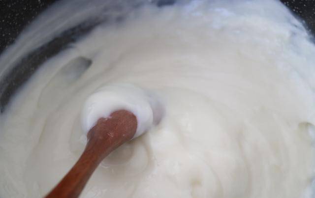 步骤四:加热一段时间之后,锅里面的牛奶淀粉混合物,就会变得比较黏稠了。到这样的一个状态之后,我们就可以关掉炉子的火焰,然后把这些材料倒一半出来,倒在一个方形的容器里,用勺子把表面抹平一些。