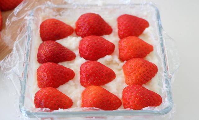 步骤五:草莓要提前清洗干净,去掉草莓的果蒂,然后竖着把草莓切成两半。我们把切好的草莓放到容器里面,再把锅里剩下的材料也倒进去,再用勺子抹平。