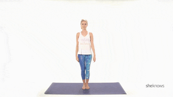 5、右脚落地,放下双臂,回到山式,在另一侧重复这个体式。整体做完可以5到10分钟,也可以视你的感受拉长时间。