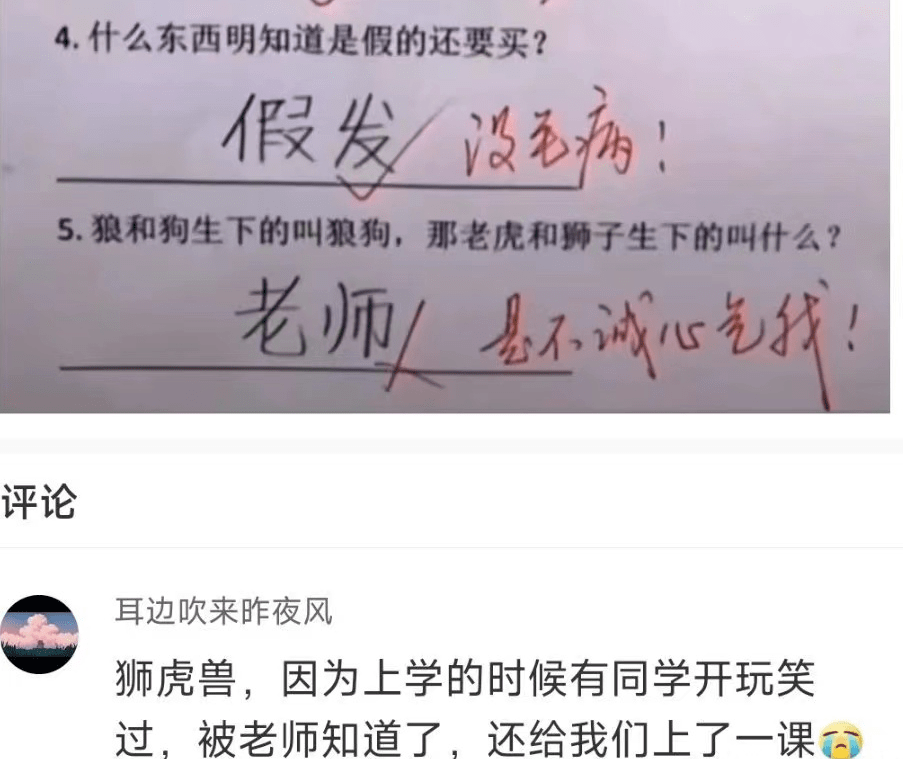 而接下来的这道题,也是属于脑筋急转弯的范畴,如果从题型上看,这名小学生给出的答案并没有错,只不过最终的答案是“老师”,老师自然是有些生气的,不过这位有趣的老师也是直接在下面留言:“是不是气我?”