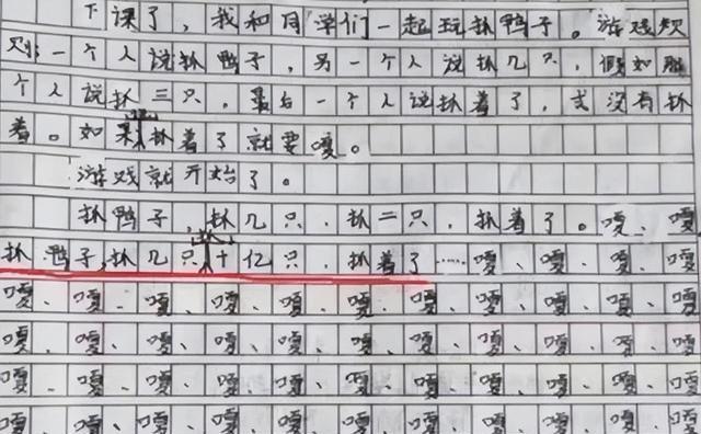 还有的孩子作文就是为了凑字数,抓鸭子,抓几只就写几个嘎字,那这十亿只岂不是本都不够写下了吗。反反复复就是“抓鸭子、抓几只、抓着了、嘎……”(此处省略一亿嘎)小编读者怕也快要睡了。这样的作文其实起不到丝毫的效果,且浪费了大把时间。
