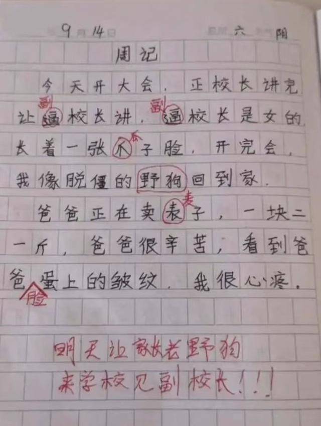 这位小学生写的周日,字倒是很棒!可这一个错别字就把整篇文章的意思弄得天壤之别啊。本来副校长是受人尊敬的一个职称,可不知副校长看到了这篇周记会作何感想。还有“麦”子以及“野狗”的形容词确实是闹出了乌龙事件。