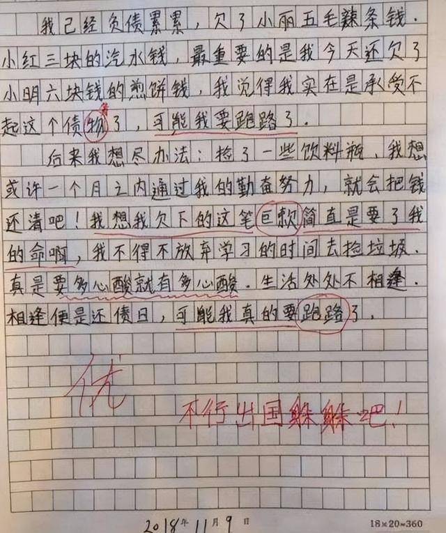 再来看这样一篇日记,不得不说,小孩子们的心思的确很单纯,很有趣也很好玩,不过这样的话写在日记里是不是有点过于直白了。这位小学生欠了同学五毛钱的辣条钱和六块钱的煎饼钱,虽说没有什么错别字,可“跑路”可不好了。