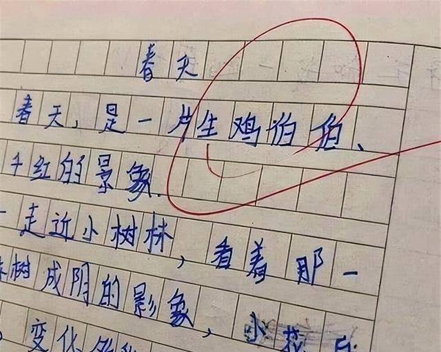 春天本是一片生机勃勃的景象,这位小学生可以看得出来文字功底还是十分深厚的,描绘的树林和花朵都很丰富。但唯一的缺陷就是这个错别字,此“生机勃勃”非彼“生鸡伯伯”。看来孩子也确实是不会写这个成语了。不过这样望文生义可不太好啊,虽说在这里也确实能行得通。可伯伯听了不知会作何感想呢?