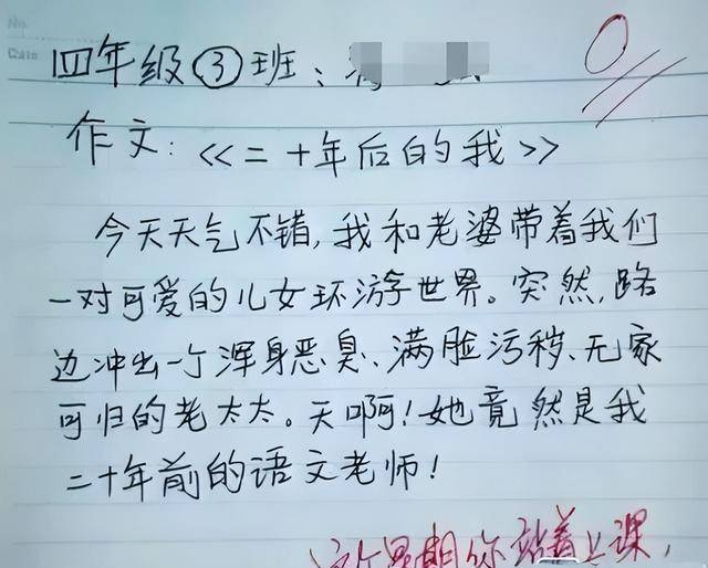 这位小学生可真敢说,四年级的孩子应当有一些思想了。写作可真的是天马行空、胡言乱语,对语文老师竟是如此描绘,在觉得好笑的同时不免令人唏嘘。