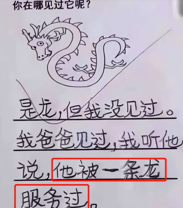 应该是小学生爸爸经常去休闲场所放松,使用“一条龙服务”,所以小学生就直接把认为这个就是真的龙,直接引用到作文当中,“经常”二字让爸爸吓出一身冷汗,估计妈妈看到后,直接连都气绿了。