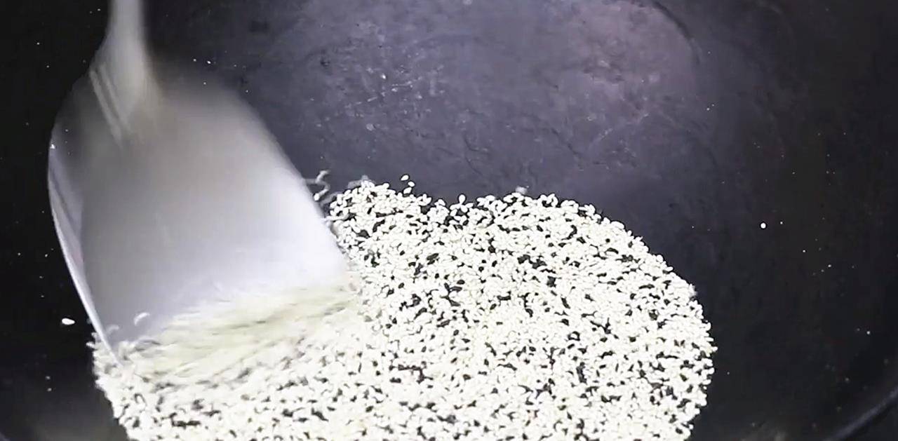 2.准备一把白芝麻跟黑芝麻混合均匀。放入热锅中,开最小火翻炒出香味,炒到表面微微发黄就可以了,不要炒太久,不然会发苦。