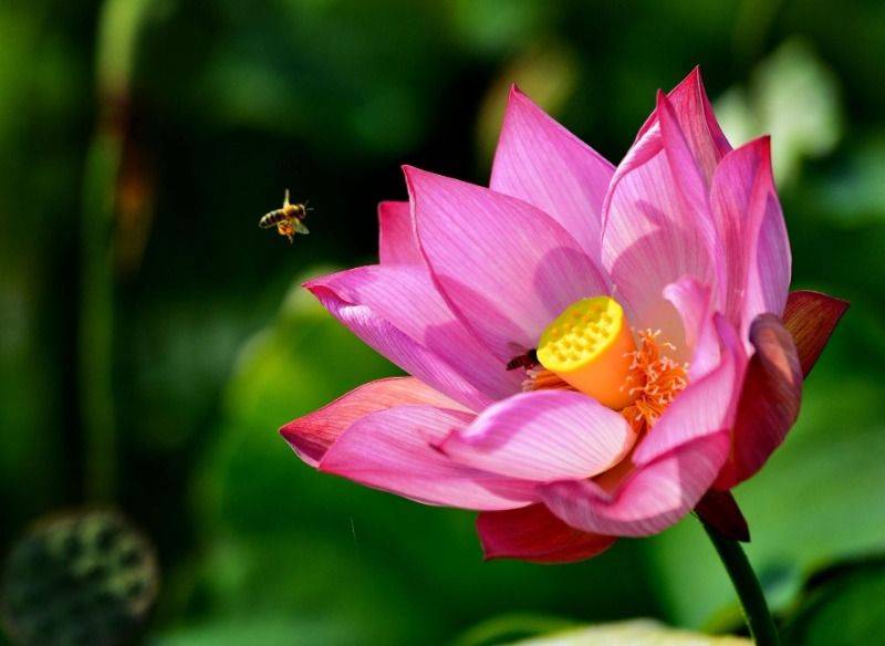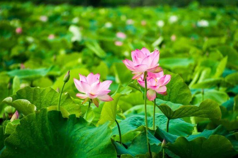 光禄的田园菏花,次第开来。花蕾如星星,撒满绿叶间,挺立在绿茎上,或核,或桃,或拳,等着绽放。已开了的花,如盏盏灯,点缀在碧海般的荷田里,柔和地灿烂,夺目地温雅。瓣或开或聚,润玉雕成一样,极富质感,却又生动天然。